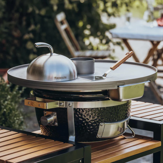 Build a complete Kamado system with the right add-ons — from protection and maintenance to cooking expansions. We stock a curated range of MONOLITH accessories including covers, fireplaces, wok stands, rotisserie options and more.